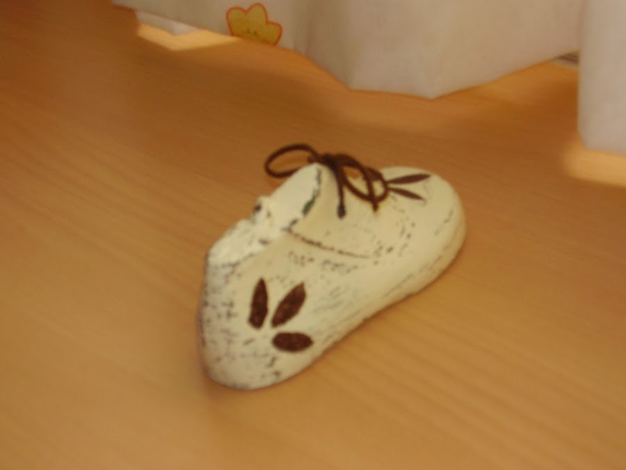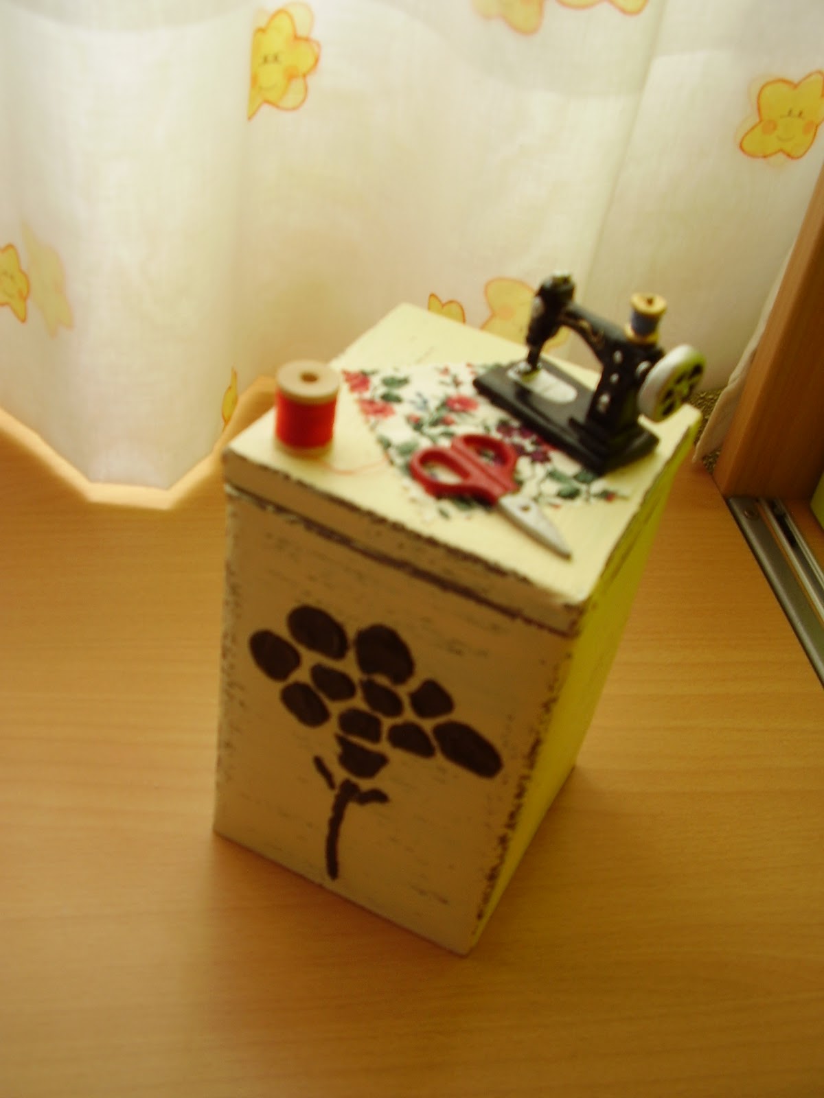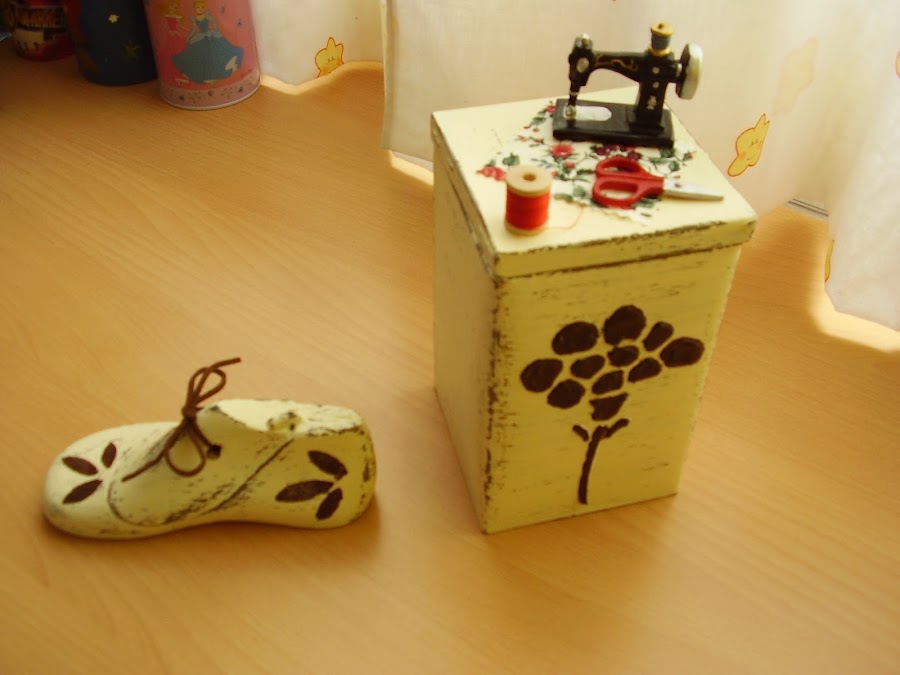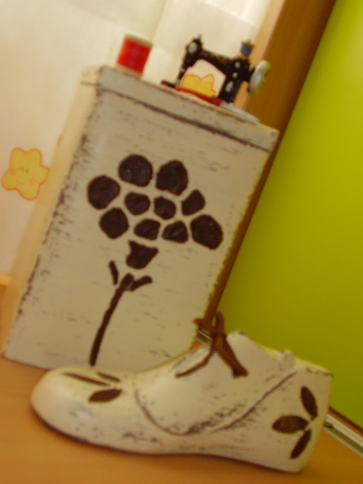 Y aquí la otra horma que me habían regalado y que aún estaba sin decorar y una caja de lata que compré y pinté porque no me gustaba sólo de lata.