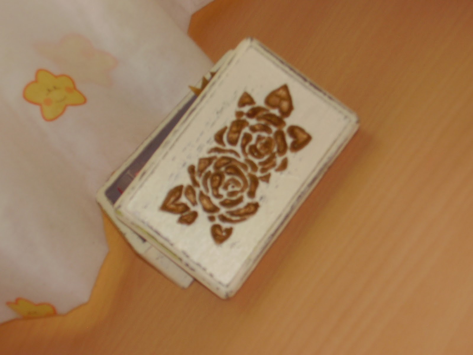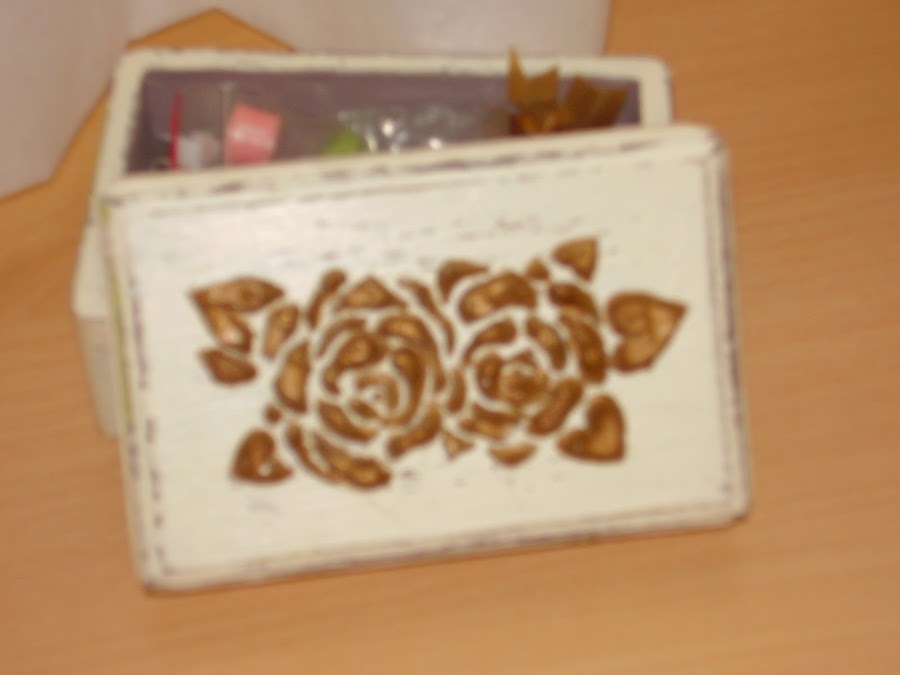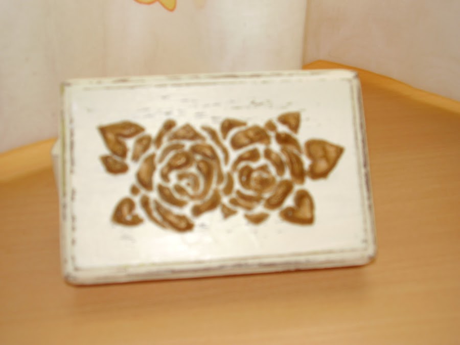 Otra caja que tenía por casa, y aún no había hecho nada con ella, así pues decidí que era hora de "vestirla" y aquí está. Primero la he pintado con gesso marrón, cuando se ha secado le he pasado la vela por donde quería que saltara la pintura, luego la he pintado de nuevo con pintura color marfil y una vez seca la he lijado, he puesto encima de la tapa y en un lateral una lámina de stencil con el motivo que observáis y lo he rellenado también de gesso blanco, una vez seco , he pìntado el motivo con pintura color oro viejo, Tiene muchos fallos porque es la primera vez que hago esto pero la próxima vez quedará mejor.