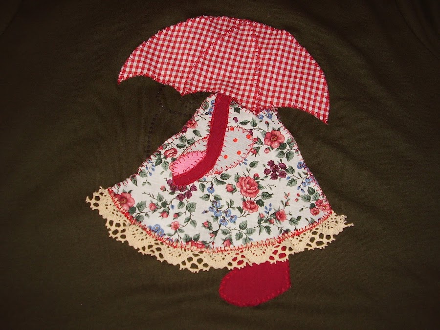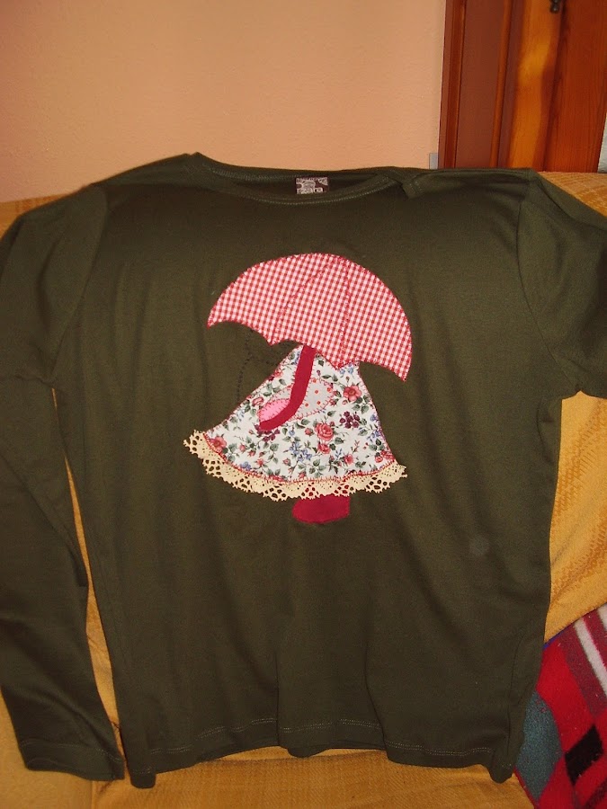 Y después de enseñaros mis preciosos regalos os muestro lo que terminado Las fotos, como siempre o salen mal o descolocadas .La camiseta, la tenía desde hace un montón de tiempo y resultaba un poco triste, sin ningún adorno, por eso decidí pegarle este diseño de estas famosas muñequitas SUNBONNET y la verdad es que me gusta como ha quedado