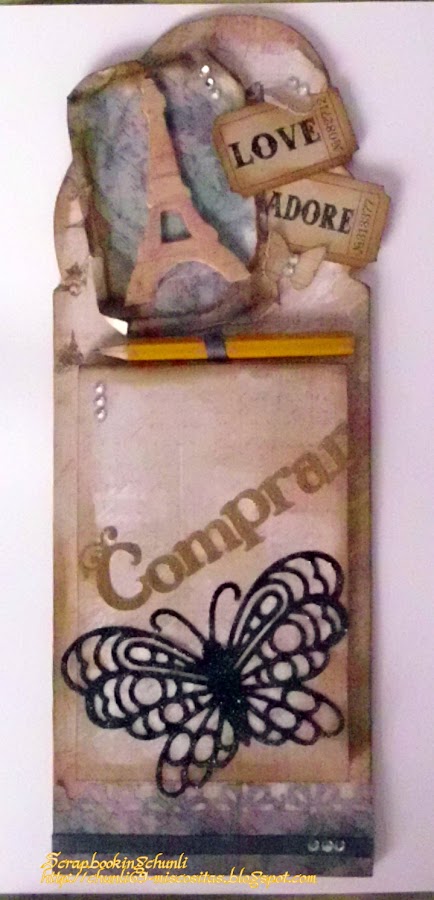 Hace unos días recibía un encargo de mi gran comercial (mi hermana), una de las cosas tenia que ser una chopping (como yo las llamo) pero.... ahí iba el kit de la cuestión terminantemente prohibido esas muñecas sin boca (como ella las llama) tenia que tener decoración parisina... después de haberla dicho que sí me acongojé por no decir otra palabra... ¿cómo lo voy a hacer si yo no tengo nada relacionado con parís? ni sellos, ni adornos, ... vamos lo que se dice nada de nada... encima, para colmo, mi amiga la craf me había abandonado y no me funcionaba en el portátil y para más INRI el ordenador de mesa había fallecido... a si que me tocó crearla... cogí un poco de madera de balsa y con mucho cuidado conseguí sacarla. Otra cosa eran los papeles, tenian que ser en negros, grises y me dio la opcion de marrones y fue como ¡¡¡¡SOCORROOOOO si yo no tengo papeles de esos colores que yo soy muy colorida!!!! pero me acordé de unos papeles que me venían al pelo y que estaban deseando ser usados, como no, de prima marketing, esa marca que últimamente no falta entre mis papeles, y bueno que más decir, que ahí os dejo la muestra. Espero que os guste.