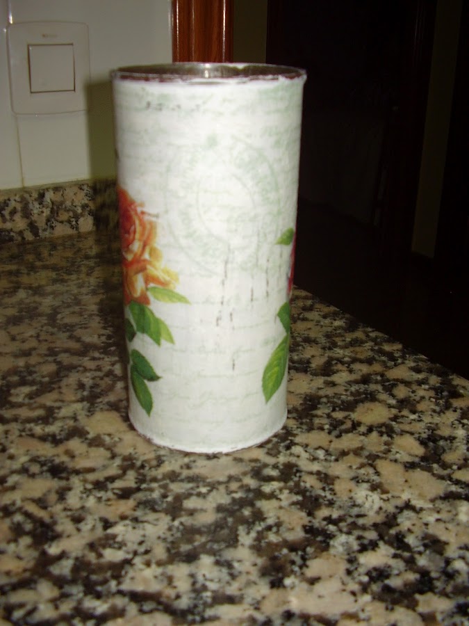 Primero le he dado una capa de imprimación para que se adhiera bien la pintura, luego el socorrido gesso, la vela por algunas zonas, un lijado fino con una lija especial para metal, y un poco de decoración con servilleta, y de este modo ha quedado, creo que compraré unas flores y de florero quedará fenomenal.