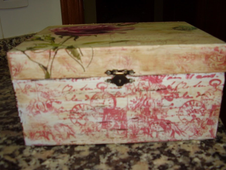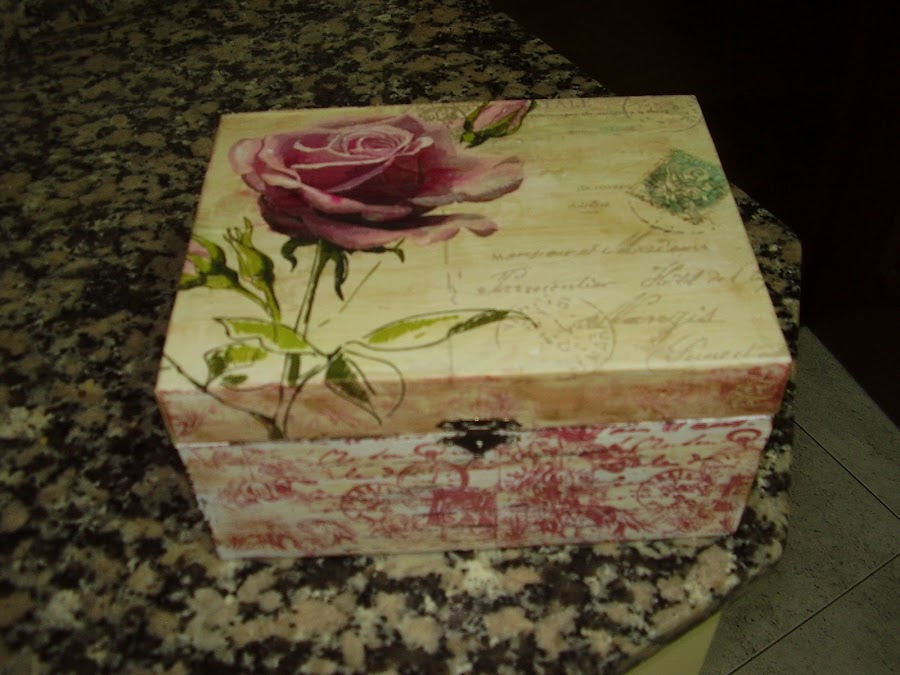 Otra caja que he cambiado ni se sabe las veces, nunca estaba satisfecha con el resultado, primero la forré de papel, luego de tela, luego ha estado pintada y con adornos de punto de cruz y ahora está como la veis y dudo mucho que sea el último cambio, aunque a mi hija le encanta, claro que a ella le gusta todo lo que hago, es muy agradecida.. Esta vez me he decidido por decorarla con sellos y con una fotocopia que imprimí de Internet. Y he aquí el resultado.