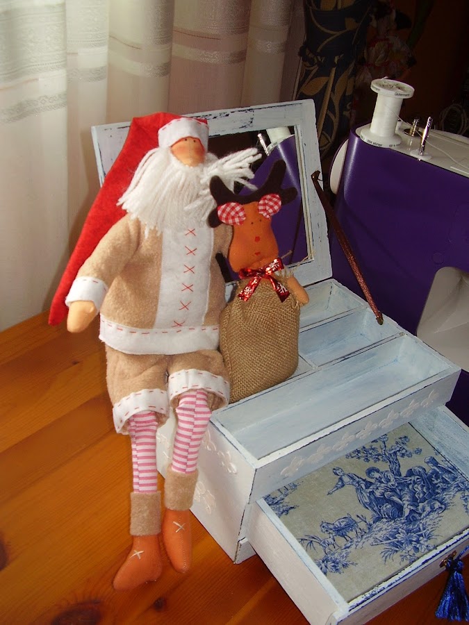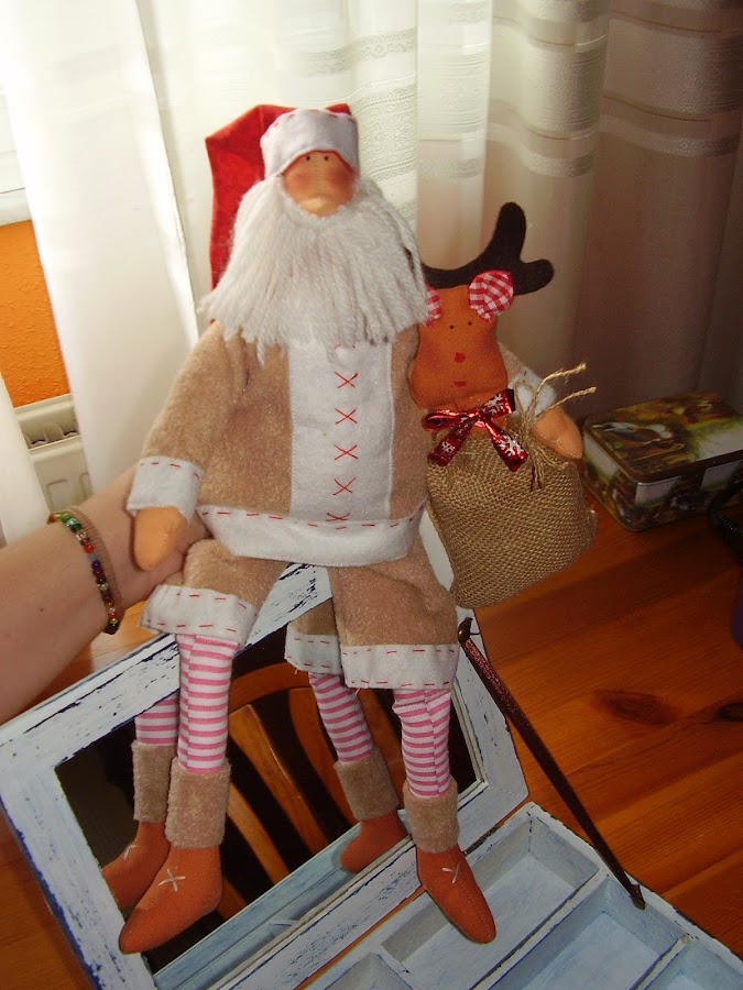 Resulta un poco raro empezar a hacer cosas de Navidad en el mes de Junio, y no suelo hacerlo, pero en esta ocasión era obligado que hiciera este Papá Noél para una amiga muy querida y muy especial para mí. A Chus, mi amiga, solo le gustan los Papá Noél Tilda y yo evidentemente no podía defraudarla regalándola otra muñeca que no fuera un Papá Noel, por tanto aquí os lo enseño. La verdad es que me encanta como ha quedado, no es excesivamente grande y como siempre va acompañado por su inseparable reno. ¿os gusta?
