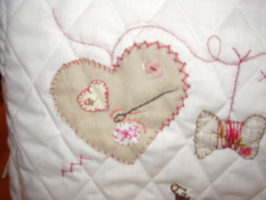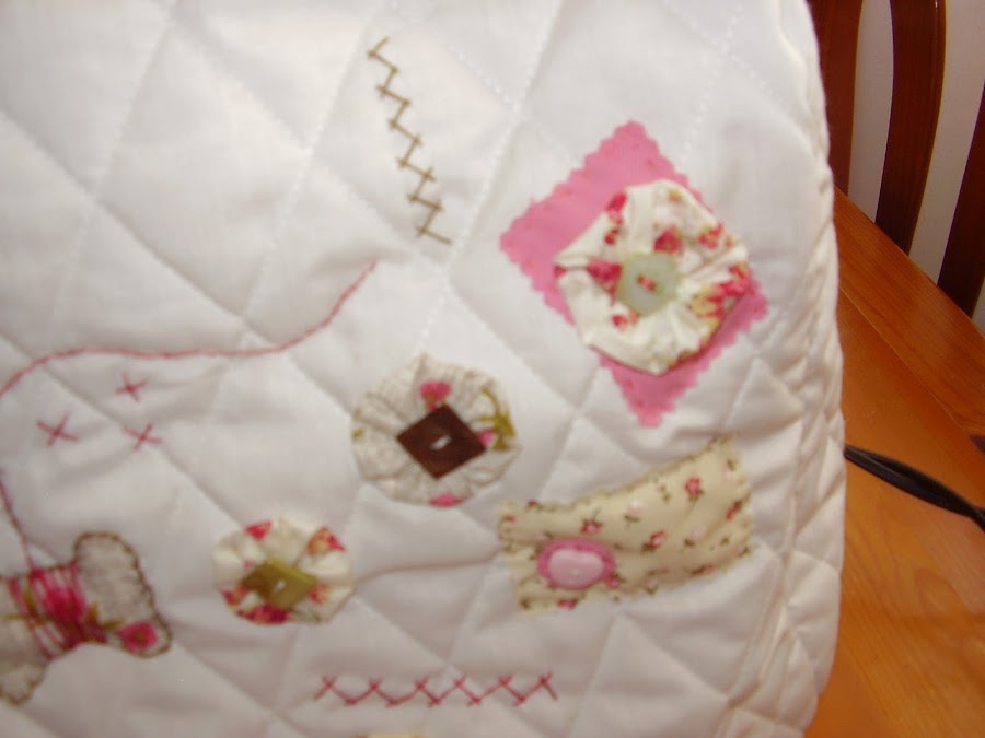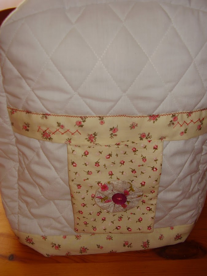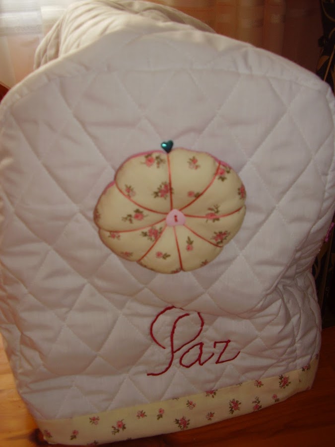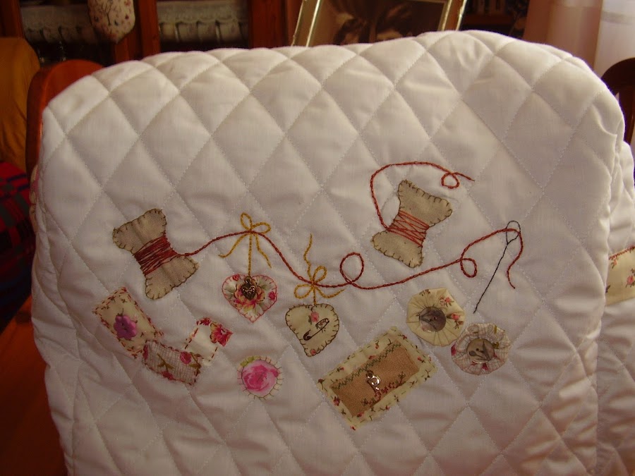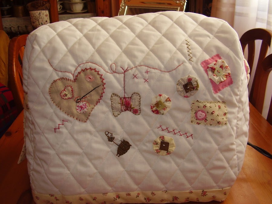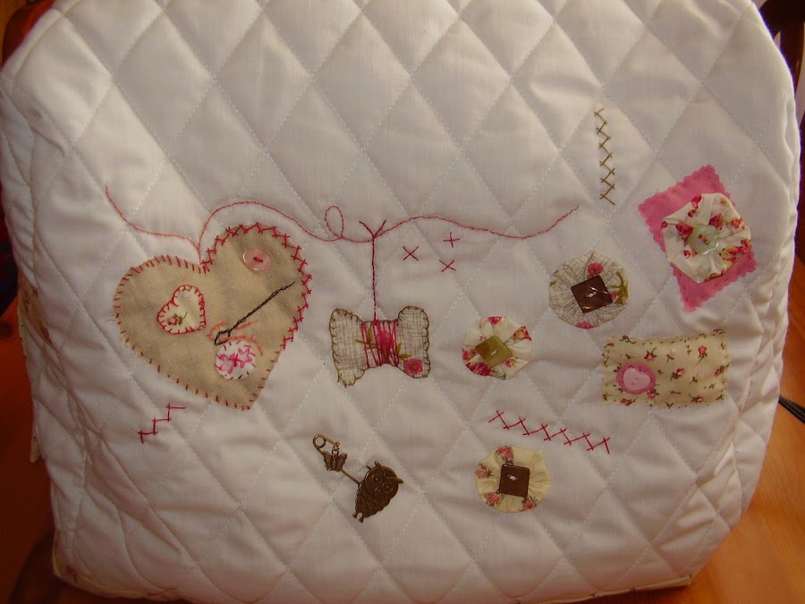 Y esta es la funda para mi máquina de coser que ya era hora de hacerla, desde Marzo que la tengo. Es un diseño de Marie Suarez, me encanta esta diseñadora, siempre consigue sorprenderme, tato por sus diseños de punto de cruz como en los bordados tradicionales. Este que le he puesto a la funda es un diseño en patch, ya lo he hecho anteriormente para una bolsa de costura que ya enseñé en una entrada anterior, y como me gusta tanto pues también he decidido aplicarlo en la funda.