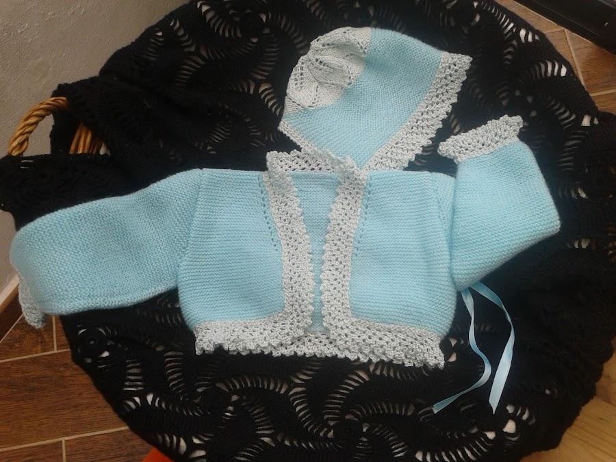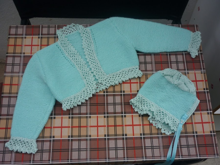 Y, para nenas de 9 a 12 meses, conjuntito de entretiempo, en lana de bebé verde agua, combinado con perlé.