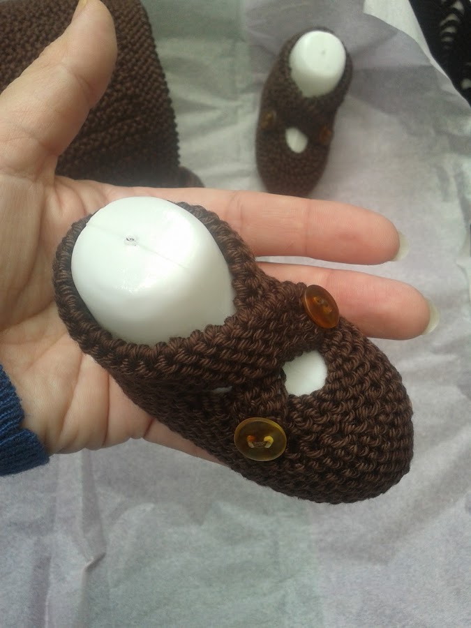 Conjuntito de capota y zapatitos en marrón chocolate. Talla: 3/6 meses. Unisex.