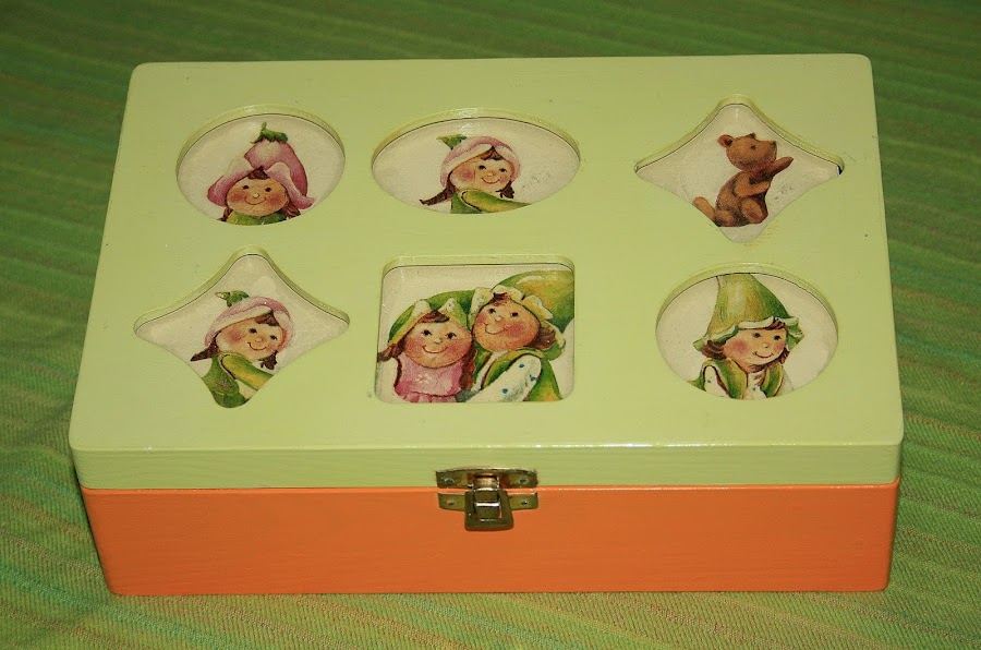 Y por último ¿cómo adornar esas piezas? Elegí unas servilletas de unas haditas, que me parecieron muy divertidas y que sus colores compaginaban a la perfección, y las pegué a las piezas con la técnica del decupage.