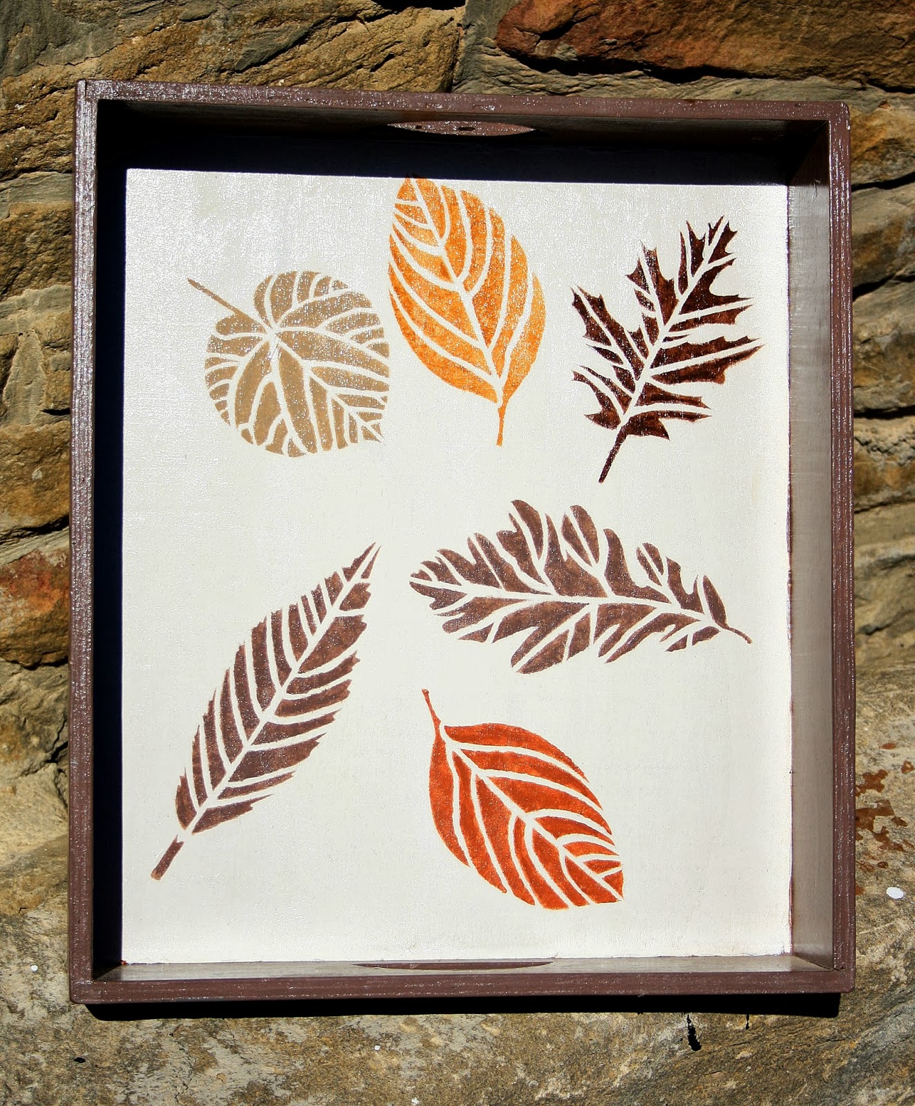 Pues utilizando todos esos colores, que como os digo me gustan tanto, he pintado esta bandeja, con hojas que se habrán caído de algún árbol y que las he ido combinando en tonos otoñales. El fondo en color crema y los lados en un marrón no demasiado oscuro, la combinación parece fina y elegante y la decoración también.