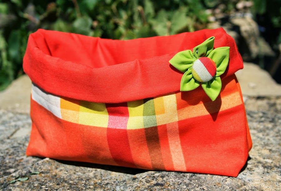 Esta pieza la he hecho con una tela de cuadros muy alegre en colores rojos, naranjas y pistachos y por dentro una telita roja, para rematar el trabajo una florecita en color pistacho con un botón forrado, que me encantan.