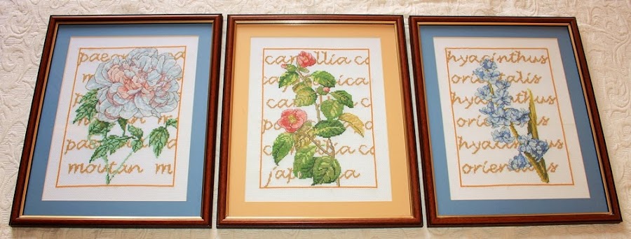 En esta ocasión decidí hacerlos en punto de cruz. Se trata de un conjunto que consta de tres cuadros con diferentes flores bordadas, dos en tonos azules y violetas y otra en tonos rojos y rosas. Cada pieza está enmarcada en madera oscura, pero el paspartú, no es igual en los tres cuadros, con lo cual el conjunto queda muy elegante y decorativo.