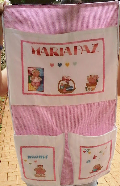 Este organizador esta bordado en punto de cruz con motivos infantiles, sus colores son vivos, el fondo de los bolsillos es de un color rosa a cuadros para resaltar un poco los diseños,en este caso es para una bebita.