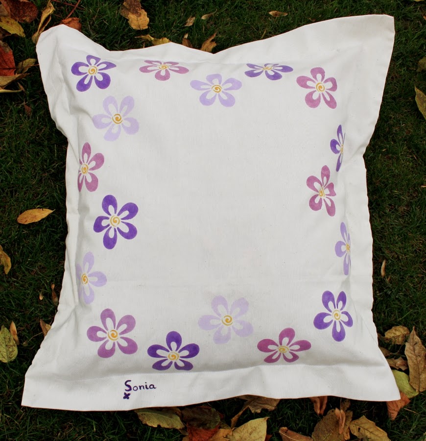 La tela elegida, un poquito recia y en color beige, pero para que me hiciera juego con la cubierta tenía que llevar flores en distintos tonos morados, así que decidí pintarlas.