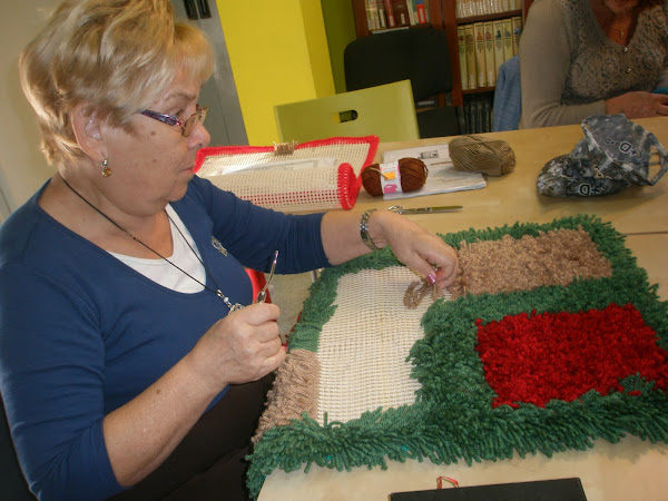 Está terminando su alfombra, y preparada para empezar otra, con otro material