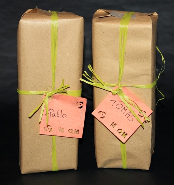 El otro día, por fin, termine y envolví unos regalos que había empezado hacía muchos días para Pablo y para Tomás. Sin exagerar os diré que igual hace seis meses que lo empecé y el que lo haya terminado ahora, no es porque cueste hacerlo tanto tiempo, sino porque lo arrincone en mi sitio de trabajo y hasta el otro día no salieron.