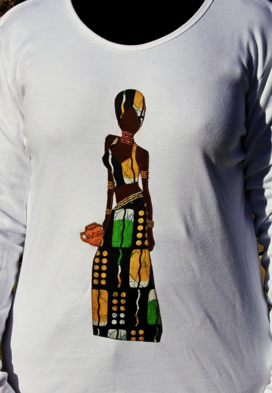 Conservo esa tela como oro en paño, porque el trozo no era muy grande, pero uno de los trabajos que he hecho es precisamente una mujer africana, vestida con un traje étnico y unas joyas muy brillantes que hacen que luzca todavía más. Y todo ello lo he plasmado en una camiseta.