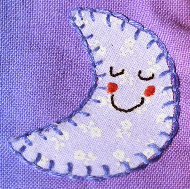 La tela elegida fue una en degradado entre azules, malvas y rosas, y como decoración una luna muy graciosita, con unos bordadines hechos a mano.