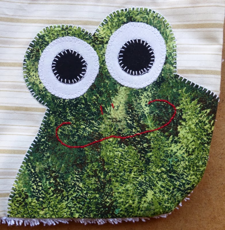 Yo enseguida me puse a idear y decidí que para Navidad les iba a regalar el primer babero del bebé. Así que elegí unos colores neutros porque no sabíamos el sexo del nuevo miembro de la familia y para decorarlo una rana muy simpática con una amplia sonrisa.