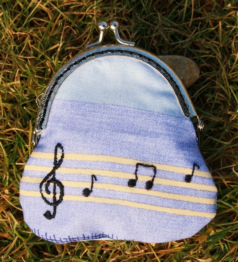 Encontré esta tela, que aunque ya sé que no lleva exactamente un pentagrama, sirvió para simularlo, y después bordadas a mano: la clave de sol y unas notas musicales. Aunque los expertos y expertas musicales lo veréis raro como decoración, a mi me pareció muy bonito. Como veis los monederos se pueden ir personalizando según los gustos de cada uno.