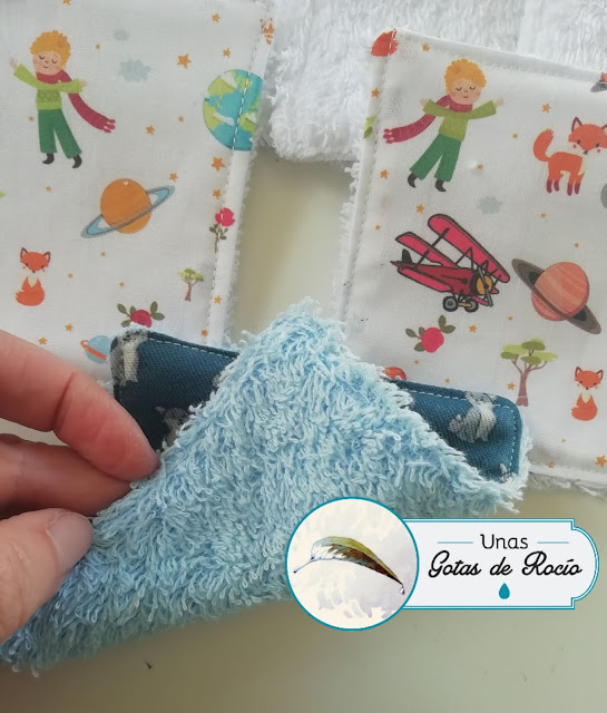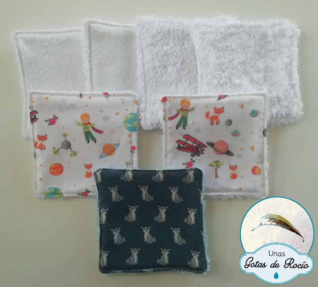 Aprovechando lo que va quedando de esta tela, he cosido algunas toallitas para desmaquillarnos, muy útiles, dos con un rizo grueso y otras dos con un rizo más suave. Y variando un poco, he hecho una más con una tela azul con zorritos y rizo celeste.