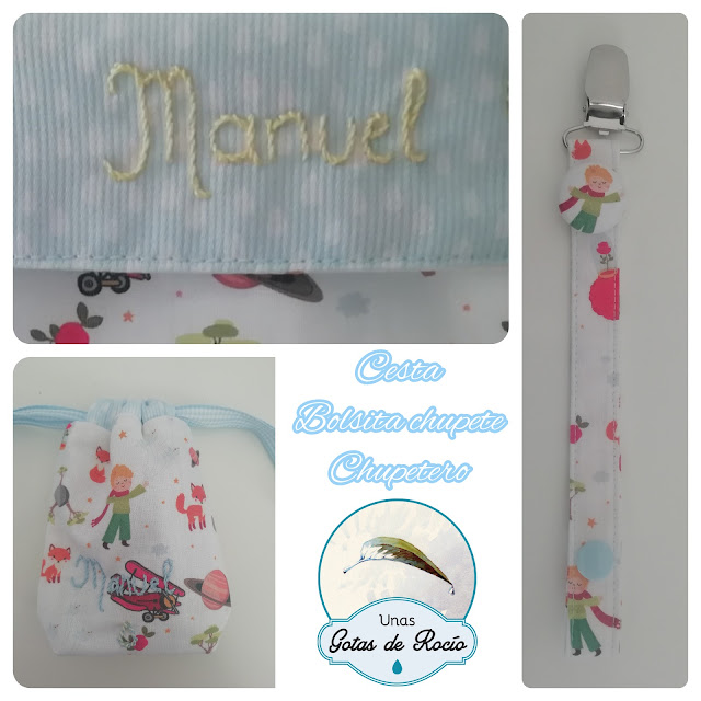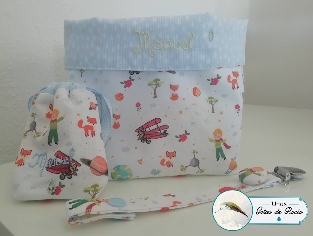 Por otra parte, os quiero enseñar también una mini canastilla que he hecho para Manuel. Lleva una cestita, una bolsita para guardar el chupete y un chupetero. Todo con la tela de El Principito y con el nombre bordado a mano. Ha quedado muy dulce.