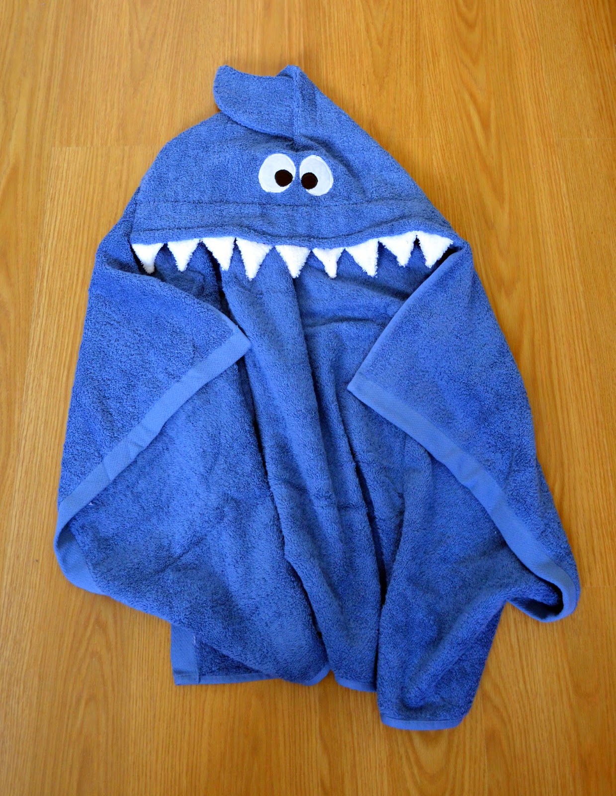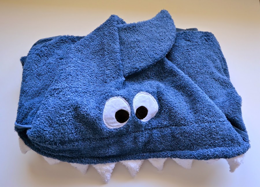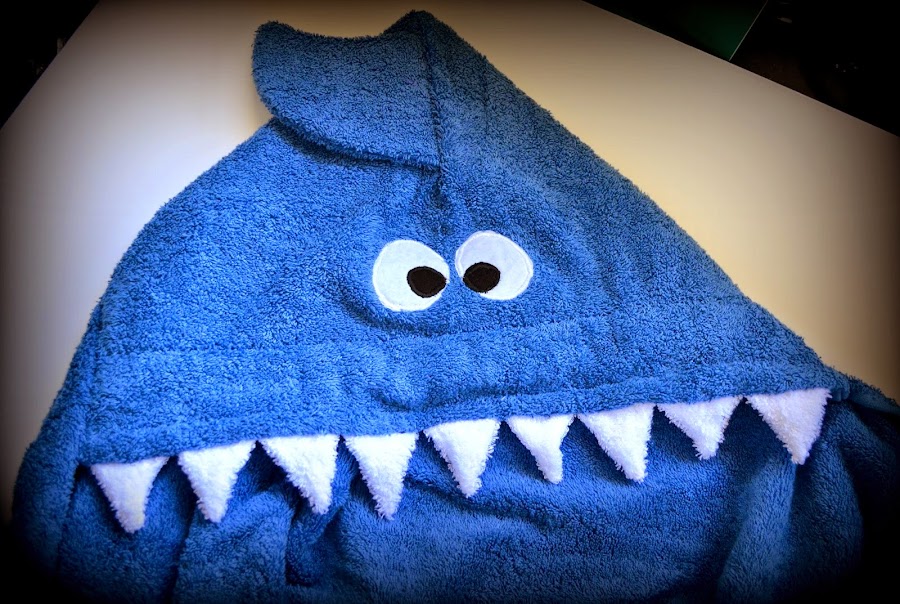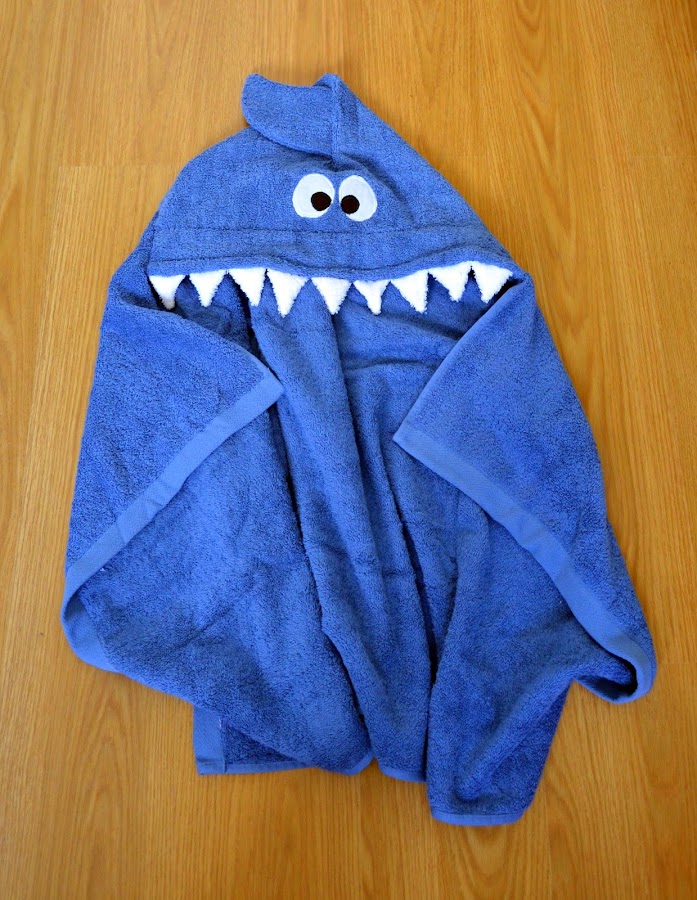 La idea la saqué del blog de Crazy Little Projects, donde puedes encontrar muchísimos y muy variados modelos. Por si no se entienden las instrucciones en inglés, hice un vídeo con el tutorial de la toalla de rana. Sólo hay que cambiar el color de las toallas y añadirle los dientes y la aleta en lugar del hocico y la lengua:
