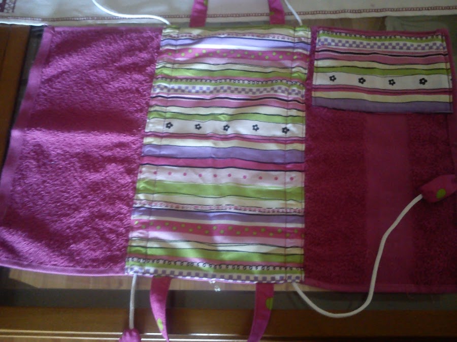 Hace poco viendo los trabajitos de Mª Carmen de http://toldiacosiendo.blogspot.com.es/ , vi que ella los hacía con toallitas pequeñas y me apeteció mas hacerlo así, ya que me parece una monada para llevarlo en el bolso. Yo en concreto se la he hecho a mi niña puesto que para el cole tiene que llevar un pequeño neceser con cositas de aseo.
