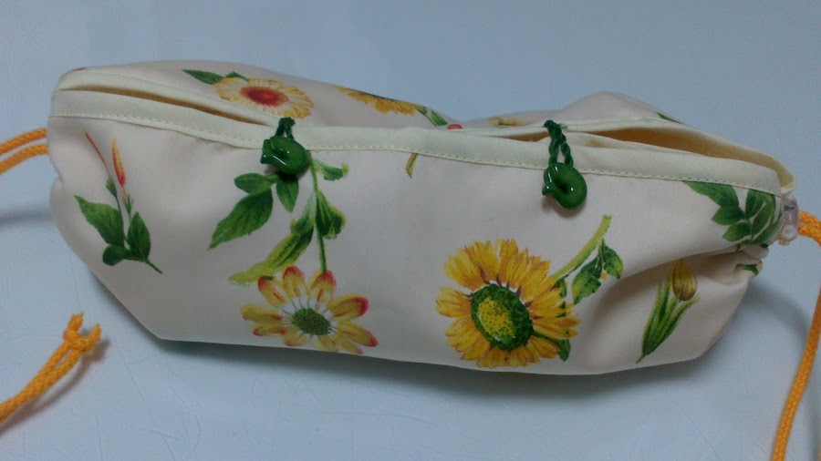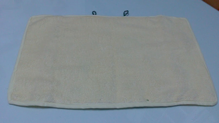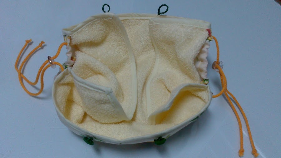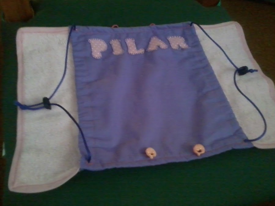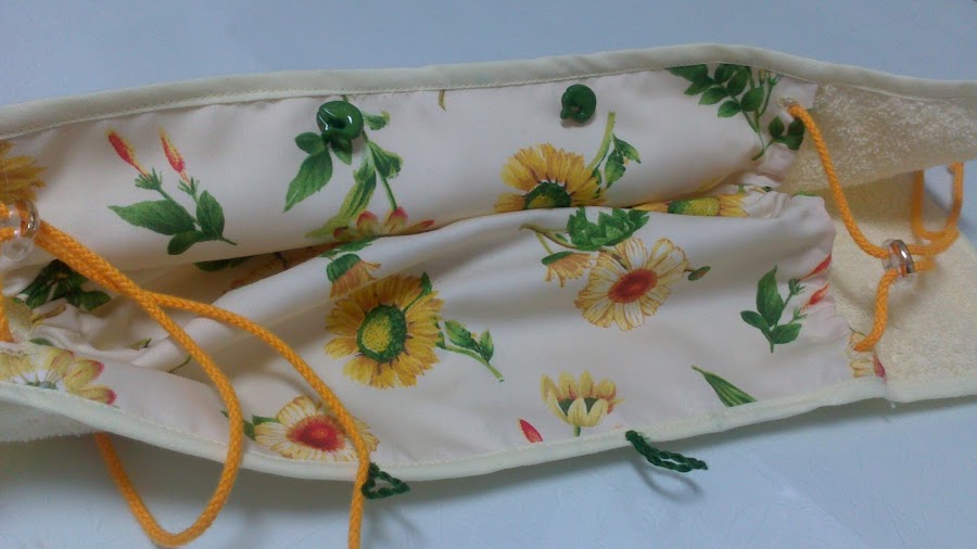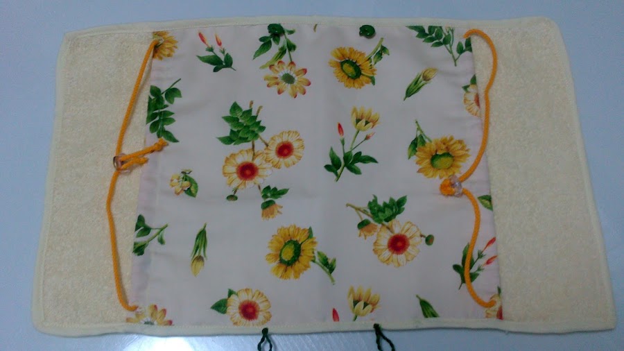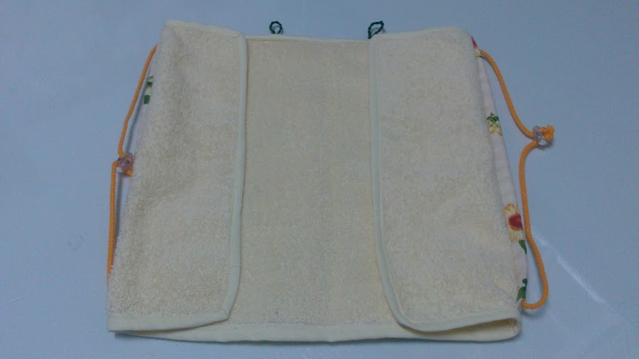 Doblamos los laterales hacia dentro y fruncimos los cordones para dar forma a nuestra toalla y por ultimo con unas presillas que hemos puesto cerramos con lo botones.