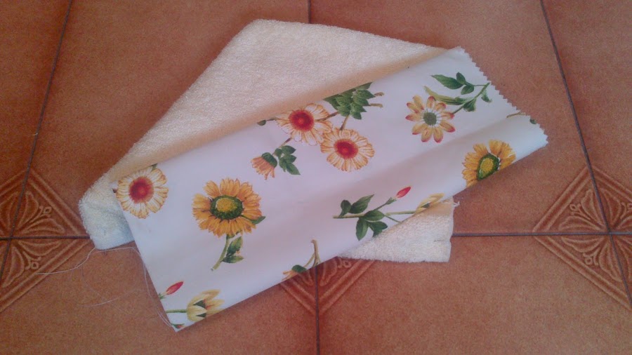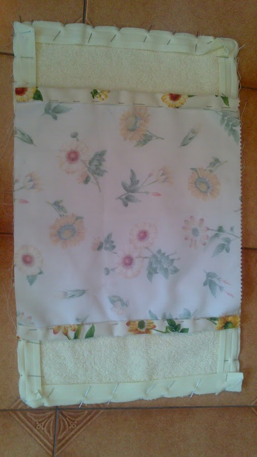 Ponemos el bies a la felpa y colocamos la tela de modo que podamos coser todo junto a la maquina, a la tela le hacemos un dobladillo en los laterales lo suficiente para dejar pasar el cordón, hay que fijarse bien en la posición del biés y la tela, para poder hacer todo en una misma pasada a la máquina.