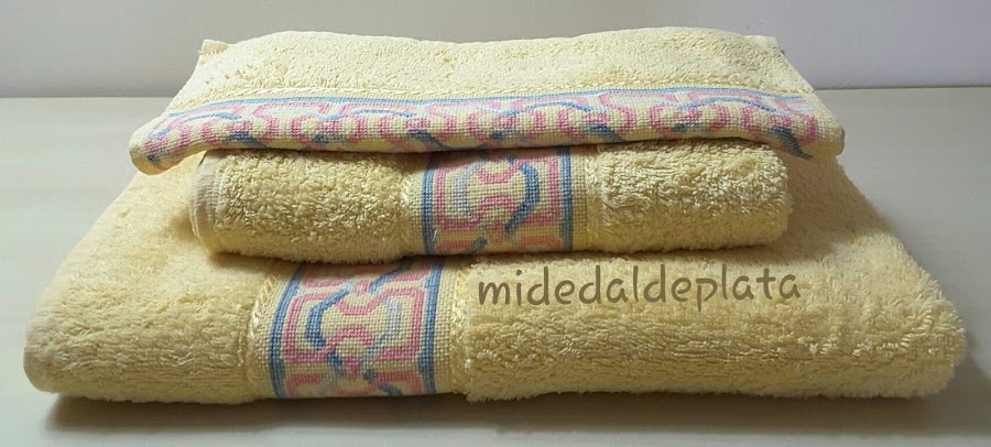 El hecho de ver en casa un gran interés por las manualidades no implica que haya una obligación de continuar con la tradición, pero sí te predispone a practicar algún tipo de creación, aunque no sea la misma que sueles ver diariamente. Viendo a mi Madre tirar de la madeja yo he acabado enredando con los bolillos, y mi hermana ha preferido, principalmente, el punto de cruz. En la actualidad, algunas de estas labores constituyen una parte de mi ajuar diario. Es el caso de este juego de toallas en un tono amarillo suave, que Merche bordó a punto de cruz en varios colores.