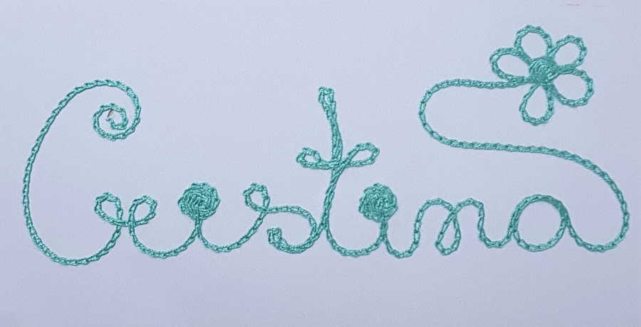 El patrón a seguir indicaba una cenefa de dibujo geométrico en rosa claro combinado con dos tonos de azul, los cuales también enmarcan el bordado.