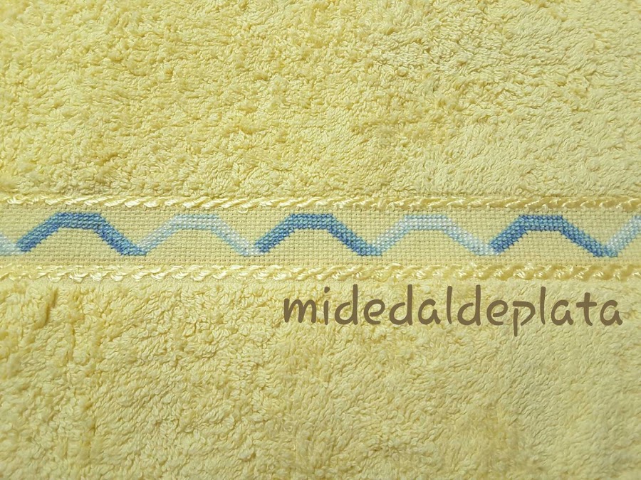 En el extremo opuesto a la cenefa, cada toalla dispone de un pequeño tramo de esterilla en el que poder realizar otro bordado a juego con el principal. Siguiendo la tendencia geométrica del diseño elegido, en este caso se realizó un bordado utilizando sólo los dos tonos de azul, ofreciendo profundidad gracias a la alternancia de zonas realizadas con hilos más oscuros.
