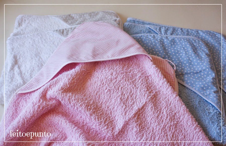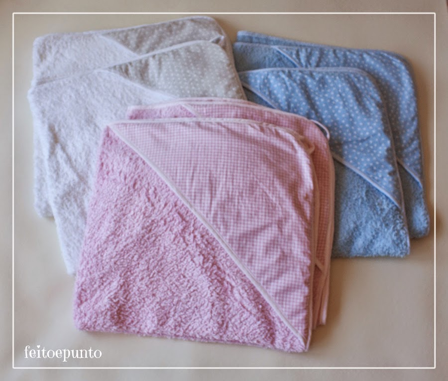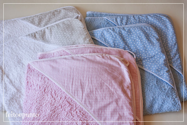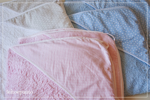 Sólo están adornadas con unas telas coordinadas a juego con el color de la toalla en la zona de la capucha, y rematadas por todo el contorno con un biés de piqué.