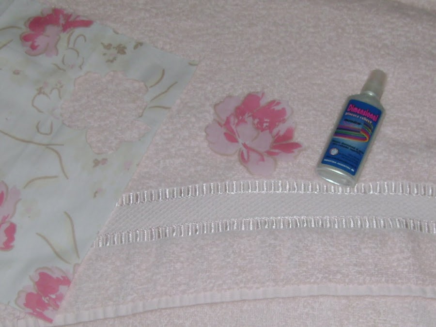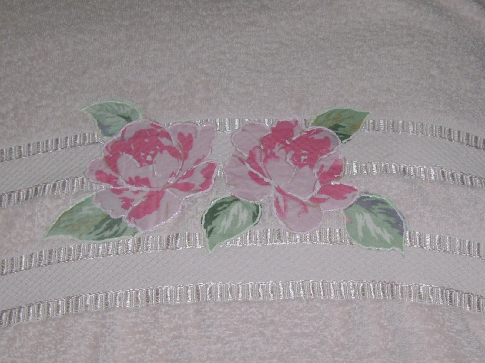 Con calor de la plancha le ponemos entretela adhesiva doble faz ( la más finita) por el revés. Cuando ya esta fria ,recortamos el motivo que elegimos o lo armamos ( ver foto superior ). Volvemos a pegar el motivo a la toalla.