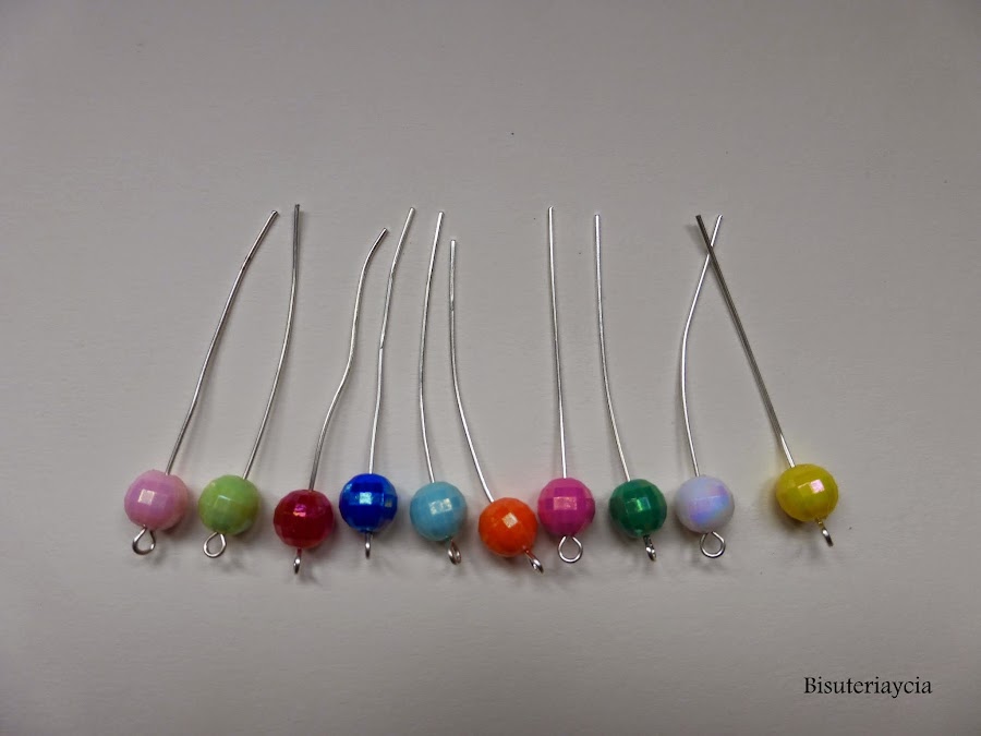 A continuación enfilaremos bolitas de colores en bastones para pendientes, usaremos los de cabeza de anilla.