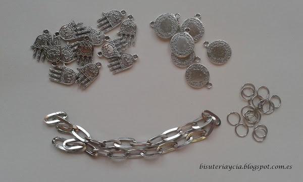 Veamos los materiales que vamos a utilizar, además de los colgantes, medallas y manos de Fatima, usaremos cadena, anillas y como no un cierre.