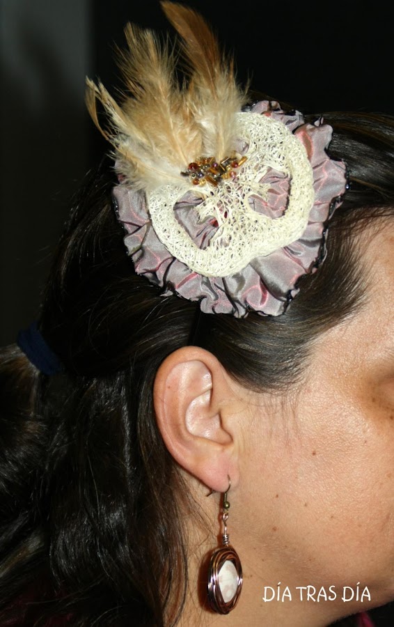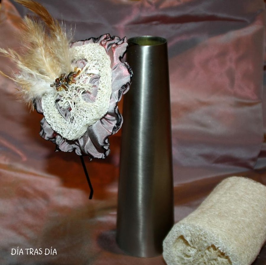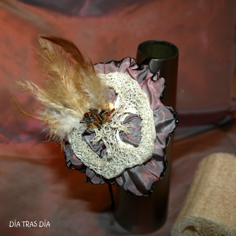 Tomando como base una diadema metálica fina de color negro, para que quedase oculta por el pelo, le he añadido una especie de flor realizada con la tela del bolso y una rodaja de lufa, una esponja vegetal ideal para exfoliación ;-). Y como remate, le añadí unas pequeñas plumas en color ocre y unas cuentas metalizadas en tonos bronces y dorados.