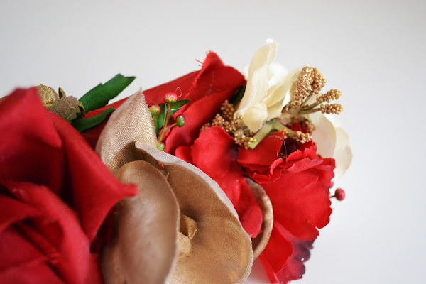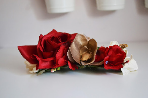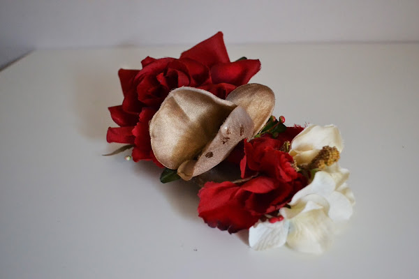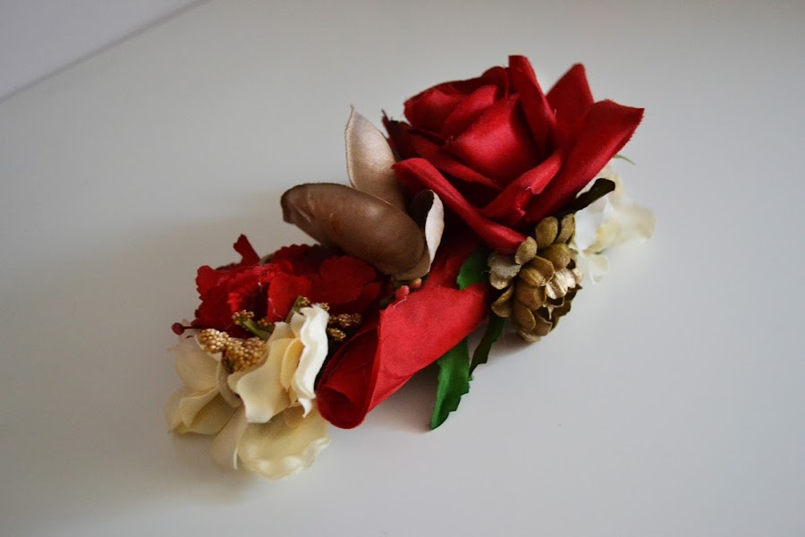 Su vestido es rojo, asique le preparé un tocado en color rojo, dorado y algo de verde para colocarlo en el lateral dela cabeza.