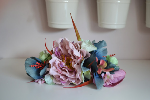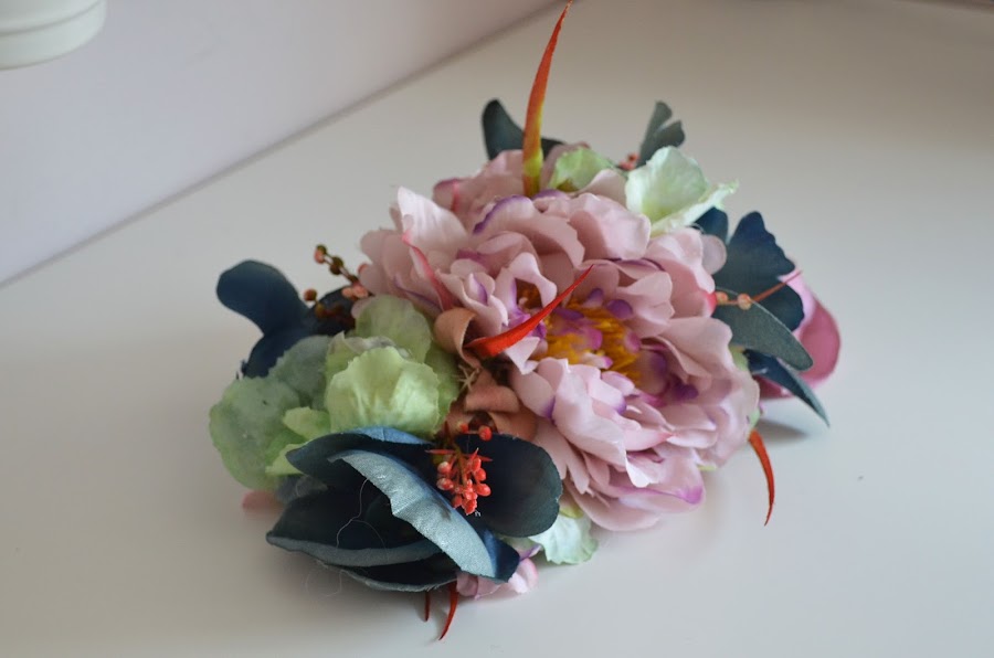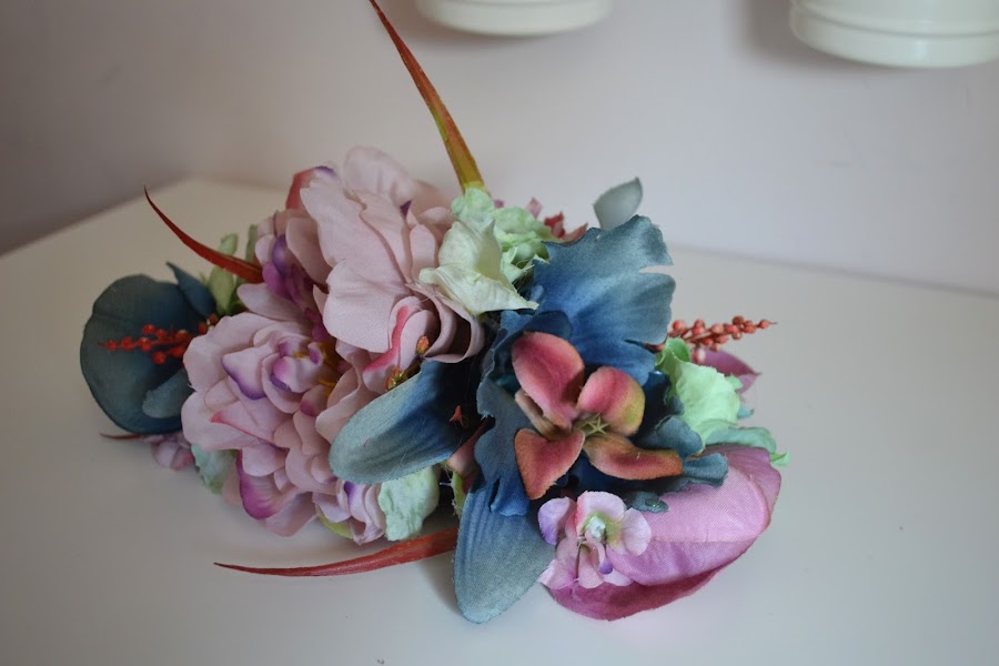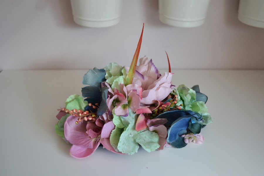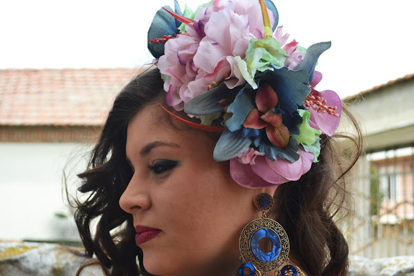 Cuando las tuve todas me puse manos a la obra y este fué el resultado.... el tocado tiene flores rosas, azules y verdes en varios tonos y le diseñé para colocarlo en un lateral de la cabeza.