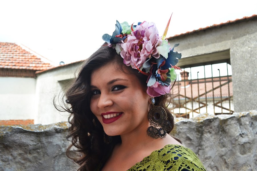 En las fotos que os dejo podéis ver cómo es por la parte delantera y por la trasera ya que cuando se coloca en la cabeza se ven ambas. En la parte delantera coloqué dos flores grandes, una rosa y la otra azul que desatacasen del resto y luego lo adorné con cuatro o cinco tipos de flores más.
