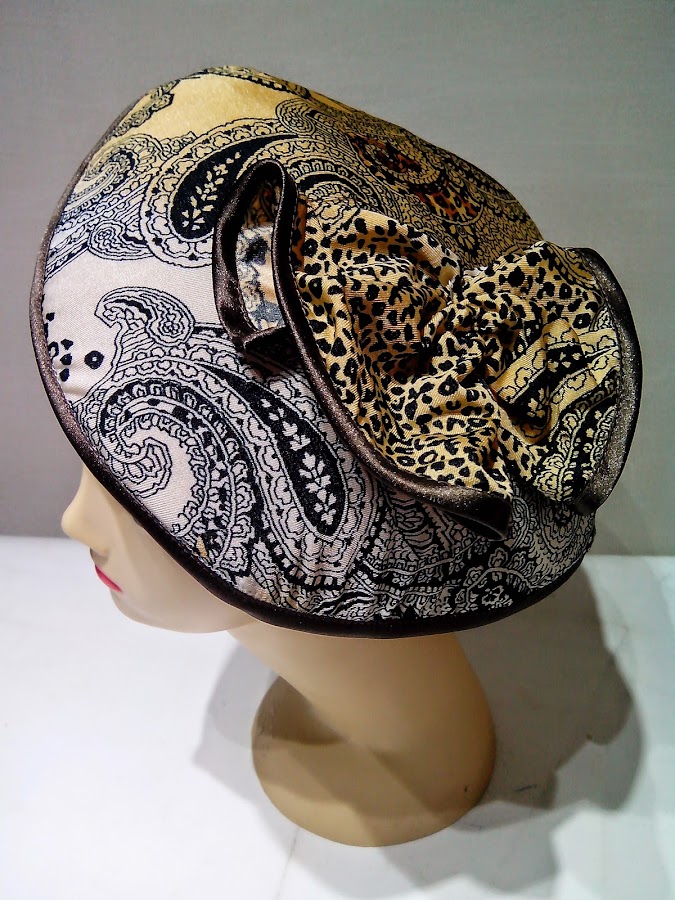 Tocado realizado en sinabay forrado de licra, y ribeteado con biés de raso. En estampado tonos grises y marrones.