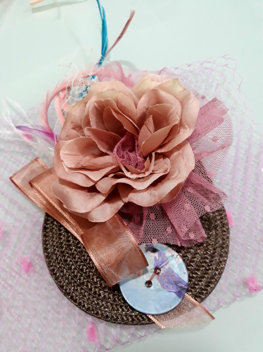 El otro es un tocado pequeño con una flor de tela y tul de plumeti y el detalle del botón pintado con una gheisa .