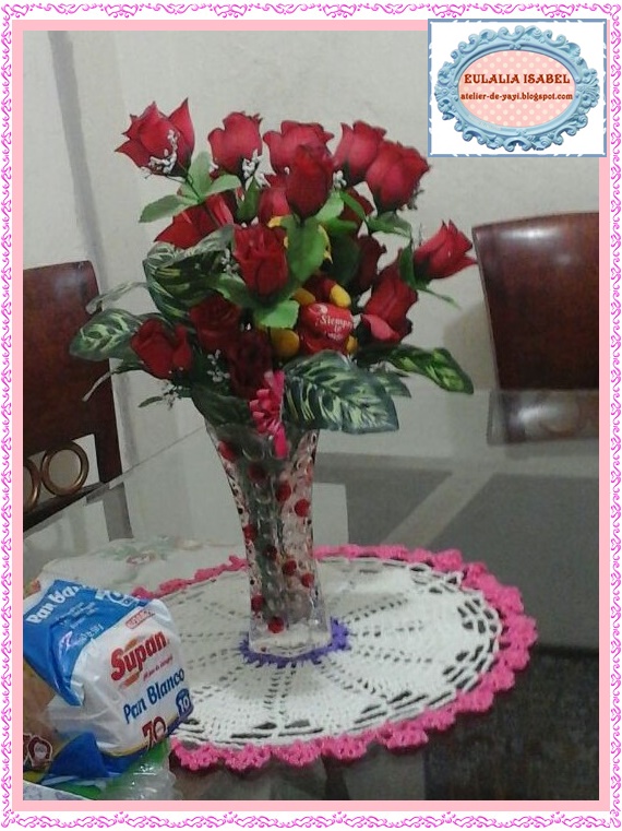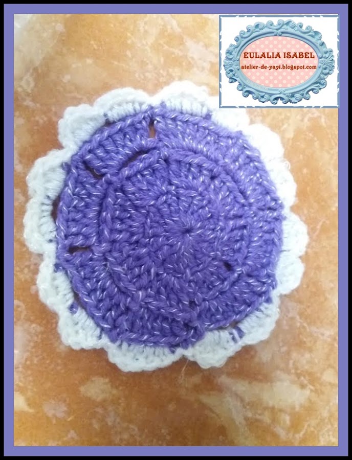 Tejido con hilo blanco, morado y rosado, para centro de mesa.de comedor o sala.