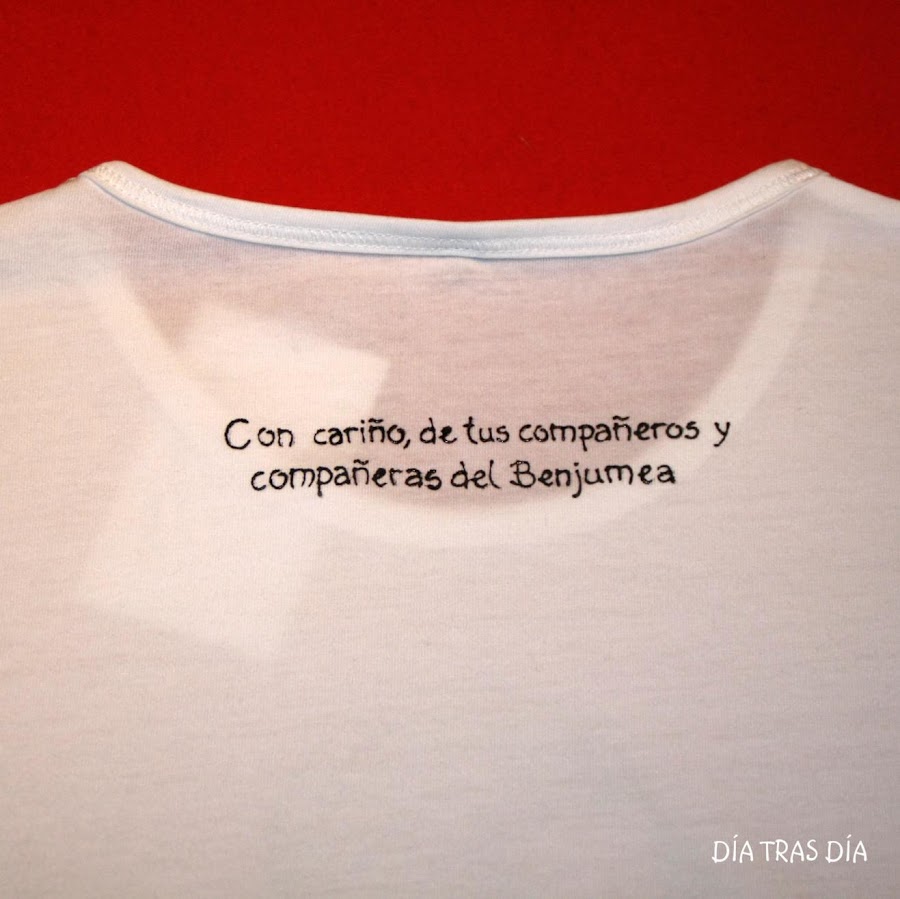 Pues la camiseta blanca fue un encargo que me hicieron para regalar a una maestra que estaba haciendo una sustitución y ya se iba del cole y sus compañeros quisieron tener un detalle con ella. Así que me pidieron que llevase una dedicatoria en la camiseta, como recuerdo de todos ellos. Yo no soy muy partidaria de poner textos de este tipo en las camisetas, porque me parece que como detalle puede resultar emotivo, pero a la hora de ponérsela después, igual no queda así demasiado ponible. Y para evitar esto, decidimos colocar el mensaje en un lugar menos visible y que no restase protagonismo al dibujo.