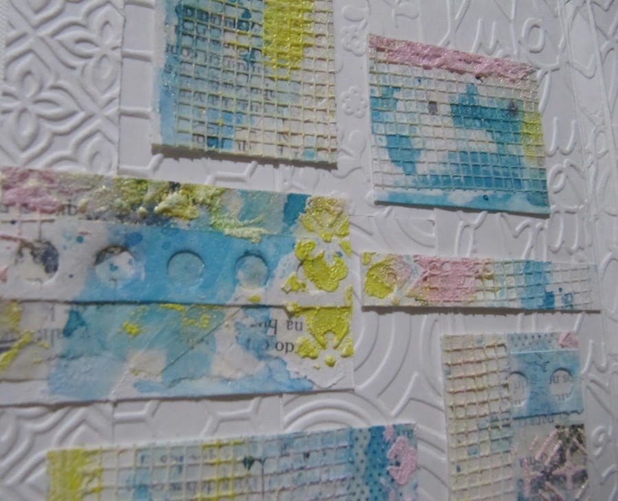 La flor es un sello de Altenew, que desde que lo vi hace ya meses me tenía muy enamorada, hasta que lo pude conseguir!!, pintado con acuarelas, sobre un tul y troqueles con volumen. Las dos páginas, fui poniendo como si fuese un mosaico trocitos de embosados de distintas carpetas, toditas en blanco!!. En la otra página también puse recortes de una lamina que hice (para este trabajo) pero ya en plan mixmedia!! Terminando dando el toque dulce unos dots