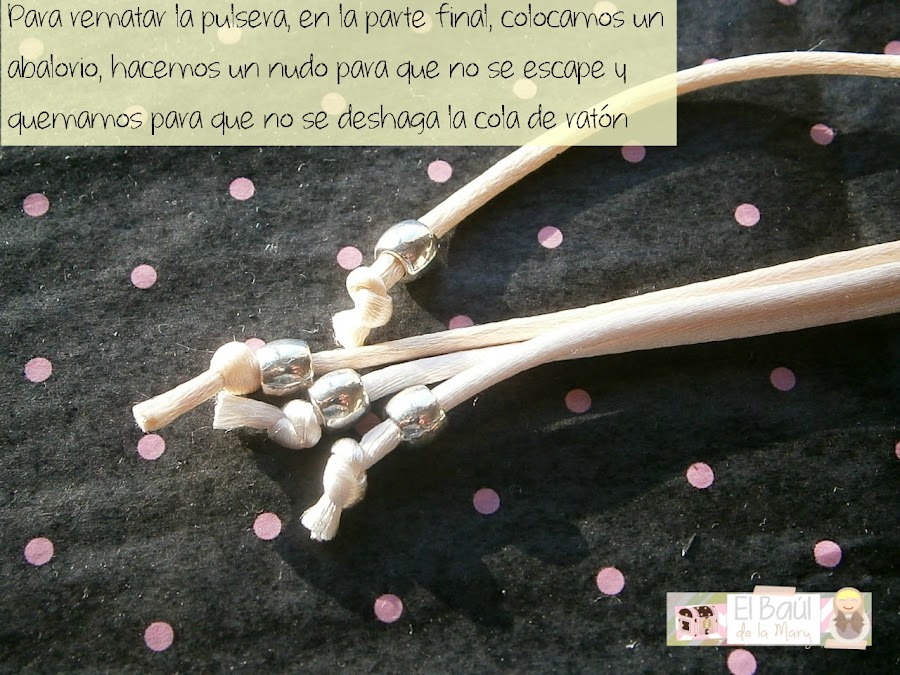 Para finalizar, en el extremo de la pulsera que quedan los cabos de la cola de ratón que nos sirven para cerrar nuestra pulsera, colocamos unos abalorios bonitos (al gusto), anudamos y quemamos con el mechero para que no se deshaga el cordón.