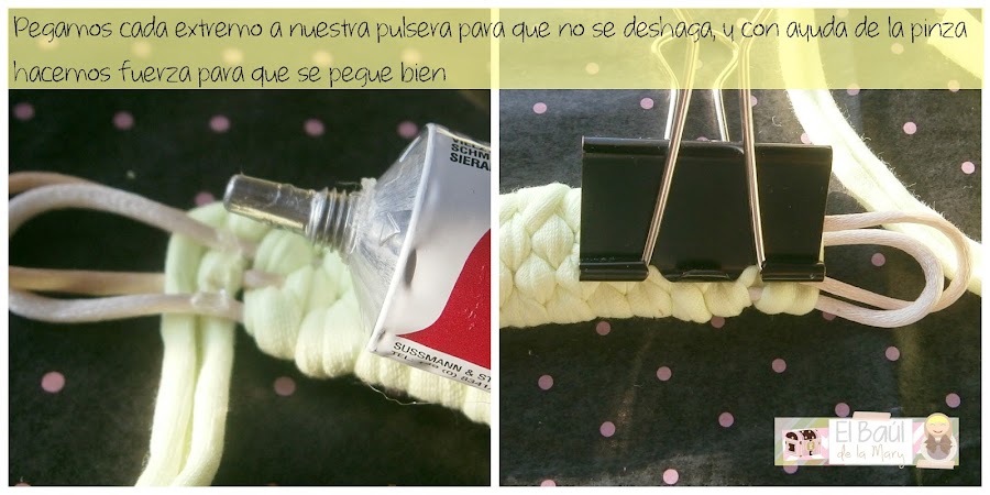 Ahora solo nos queda rematar la pulsera para que no se deshaga. Para ello, soltamos las pinzas y con el pegamento para textil, o cola caliente depende de la prisa que tengais, pegamos el trozo de cabo que tenemos suelto a nuestra pulsera, cortamos lo que sobra y dejamos secar. Esta operación debemos hacerla en cada lado de la pulsera.