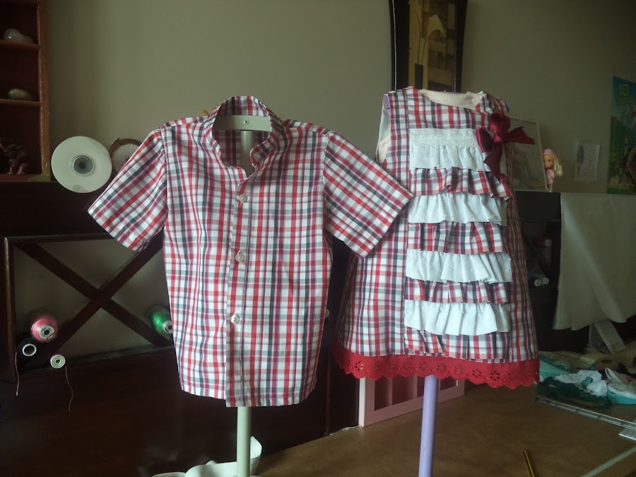 ...hobo que echar mano de otras telas para los detalles y de puntillas...camisa para el niño y vestido para la peke...coordinados....