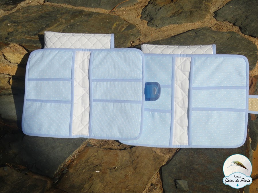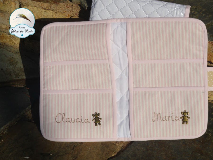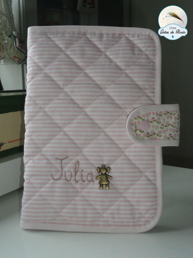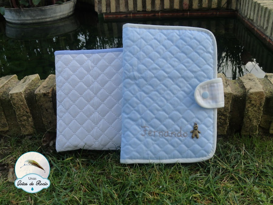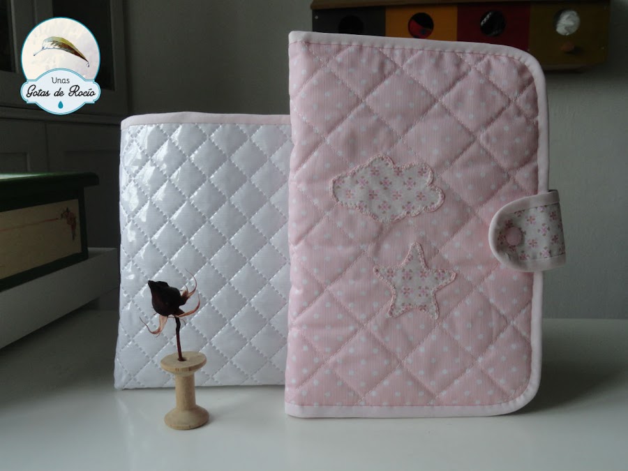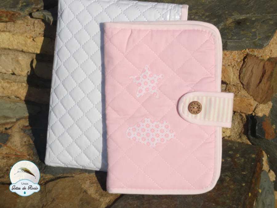 Continúo con otros portadocumentos. Como siempre, la carpeta de tela va entretelada para que tenga cuerpo. Además va perfectamente protegida en una funda plastificada. En esta ocasión, como iba dirigido a dos hermanas, los nombres los puse en el interior y dejé para el exterior un par de aplicaciones con una estrella y una nube.