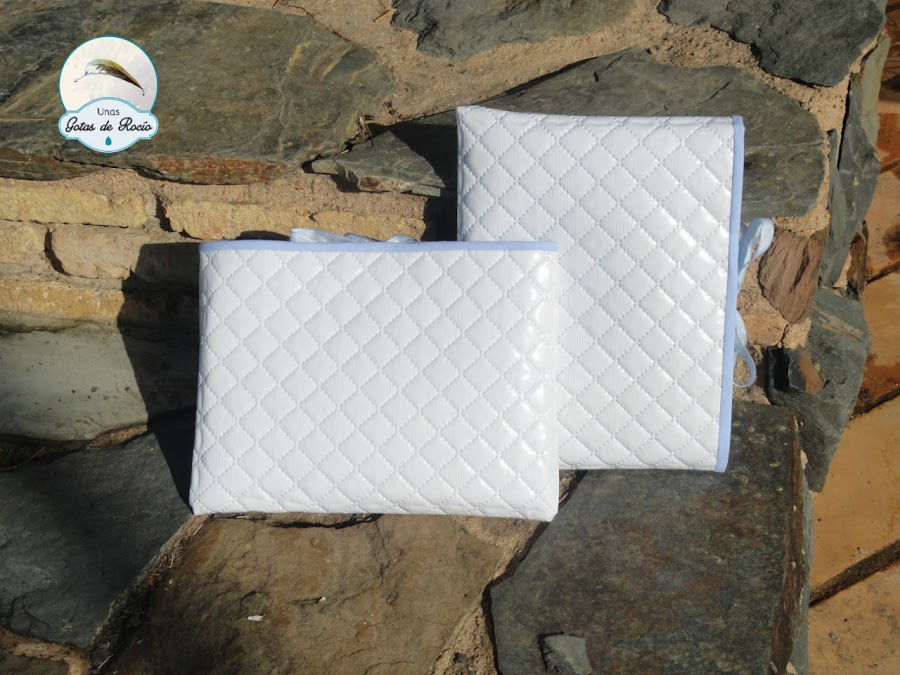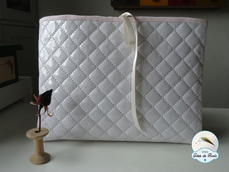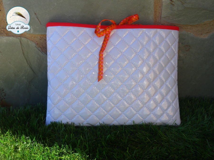 El lazo que cierra la funda plastificada junto con el bies rojo da colorido al piqué blanco.