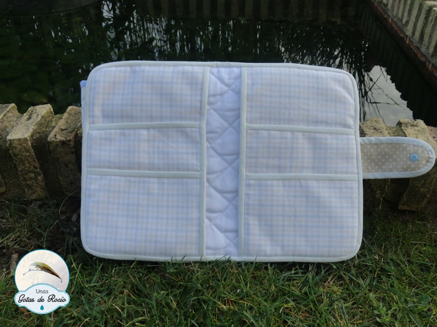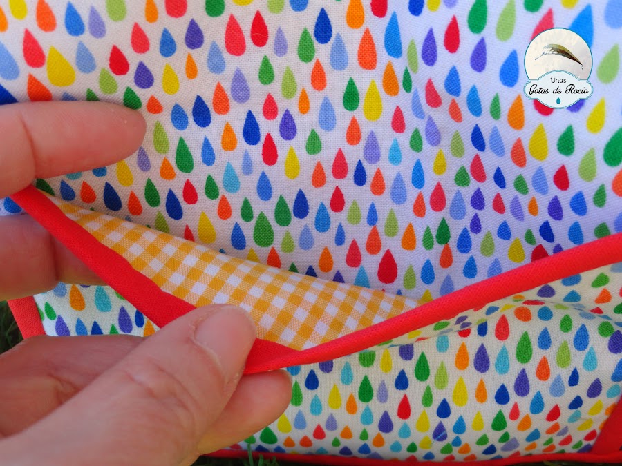El interior lleva un estampado que parece que lo han hecho pensando en mí y cientos de gotas de colores alegran los bolsillos del portadocumentos. ¿Recordáis mi última entrada donde os anticipaba un trabajo con esta tela? Pues aquí lo tenéis.